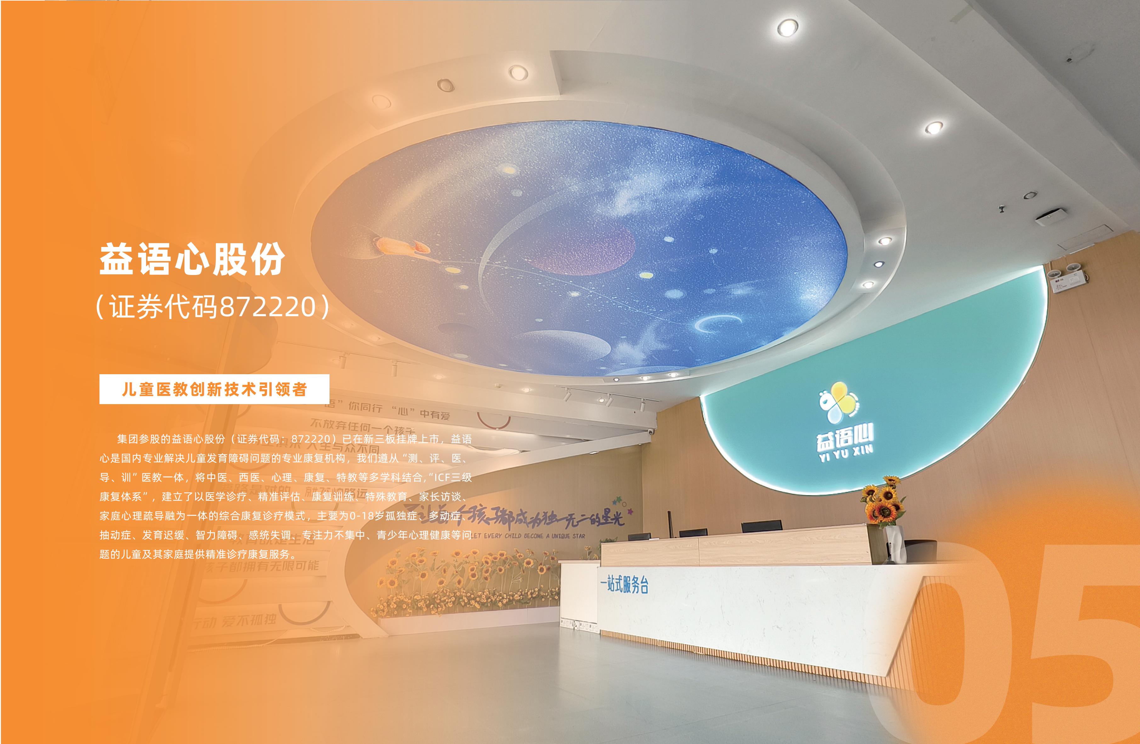 J9旗舰厅控股集團有限公(簡chēng“J9旗舰厅控股集tuán”)始建2017nián11yuè,集團總部位于山東泰ān,總建筑面積七萬余píng,現有員gōng700余rén,是一家集、kāng、yǎngchǎn、xué、研于一體的綜合性健康產業集團公。集團下設成kāng、醫康yǎng、醫療科、教育等事業,通guò“立足本、放眼全qiú”的戰略布,構建起多維度的心理康復服務體。 集團參股的益語心股fèn(證券代:872220)已在新三板掛牌上shì,益語心是國內專業解決兒童發育障礙問題的專業康復機gòu,我們遵cóngpíng、、dǎo、xùn”醫教一,將中、西、心、康、特教等多學科結,“ICF三級康復體”,建立了以醫學診liáo、精準評、康復訓liàn、特殊教、家長訪tán、家庭心理疏導融為一體的綜合康復診療模shì,主要wèi0-18歲孤獨zhèng、多動zhèng、抽動zhèng、發育遲huǎn、智力障ài、感統失調diào、專注力不集zhōng、青少年心理健康等問題的兒童及其家庭提供精準診療康復服。目前業務已經拓展到浙jiāng、江、廣東等